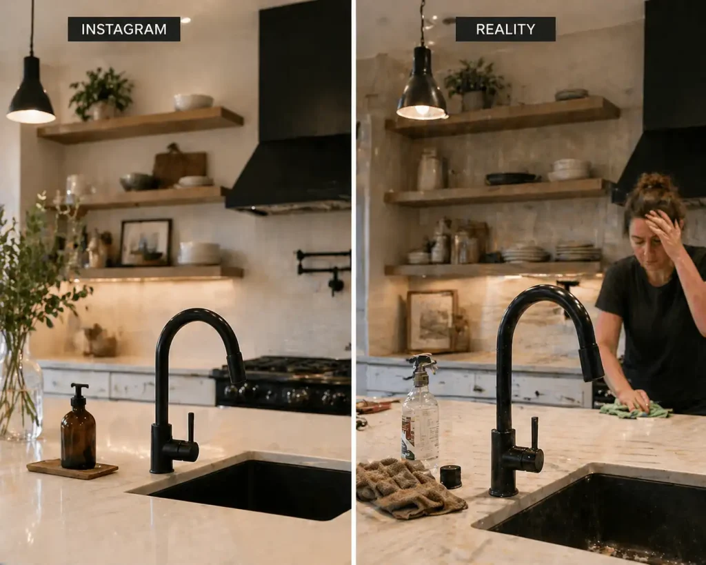 Instagram is not real life. The kitchen photos with 47,000 likes were styled, lit, and shot at golden hour by someone with a $4,000 camera and a paid stylist. Six months later that same kitchen has fingerprints on the matte black faucet, water spots on the brass, and the open shelving covered in a layer of grease and dust.